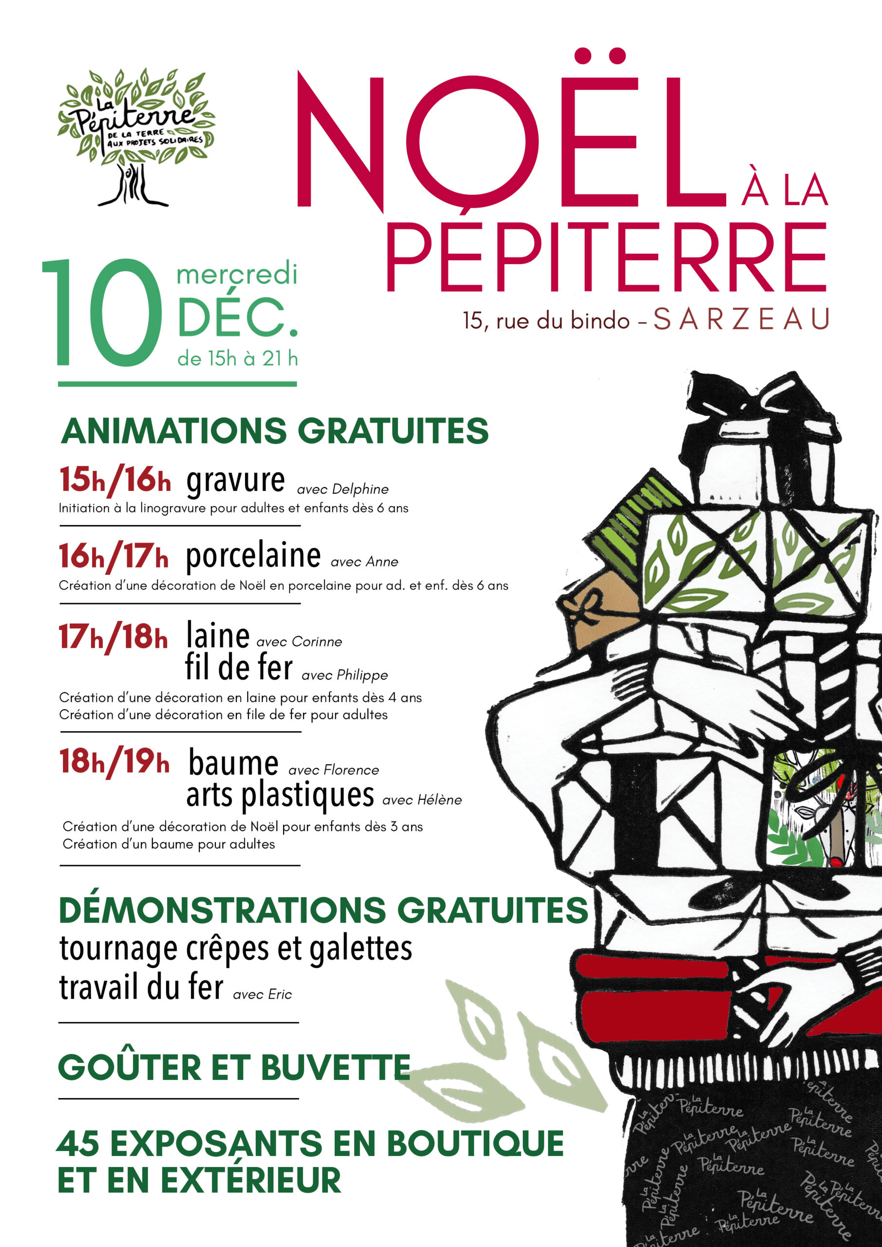 Au programme : des ateliers adultes et enfants, des démonstrations de savoir-faire locaux, un goûter crêpes et quelques exposant-es soigneusement sélectionnés viennent compléter l’équipe de la boutique.